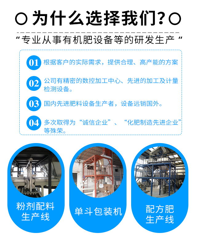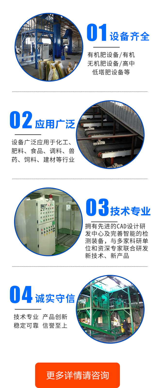 公司产品涵盖3-30万吨有机肥设备、有机无机肥设备、转鼓蒸汽复混(合)肥设备、脲甲醛肥设备、氨酸肥设备、氨化肥设备、全融溶喷浆肥设备、尿基喷浆肥设备、挤压肥设备、BB肥设备,各种颗粒料、粉料全自动及半自动定量包装机、各种型号电子流量称、皮带秤等。我们根据客户的场地和实际需求提供定制化的设计和生产,可承接复杂物料的配料、计量包装线,包括BB肥、复混肥、全融溶喷浆肥等设备的生产。产品应用广泛、设备电、气动搭配合理,运行稳定、好评如潮。